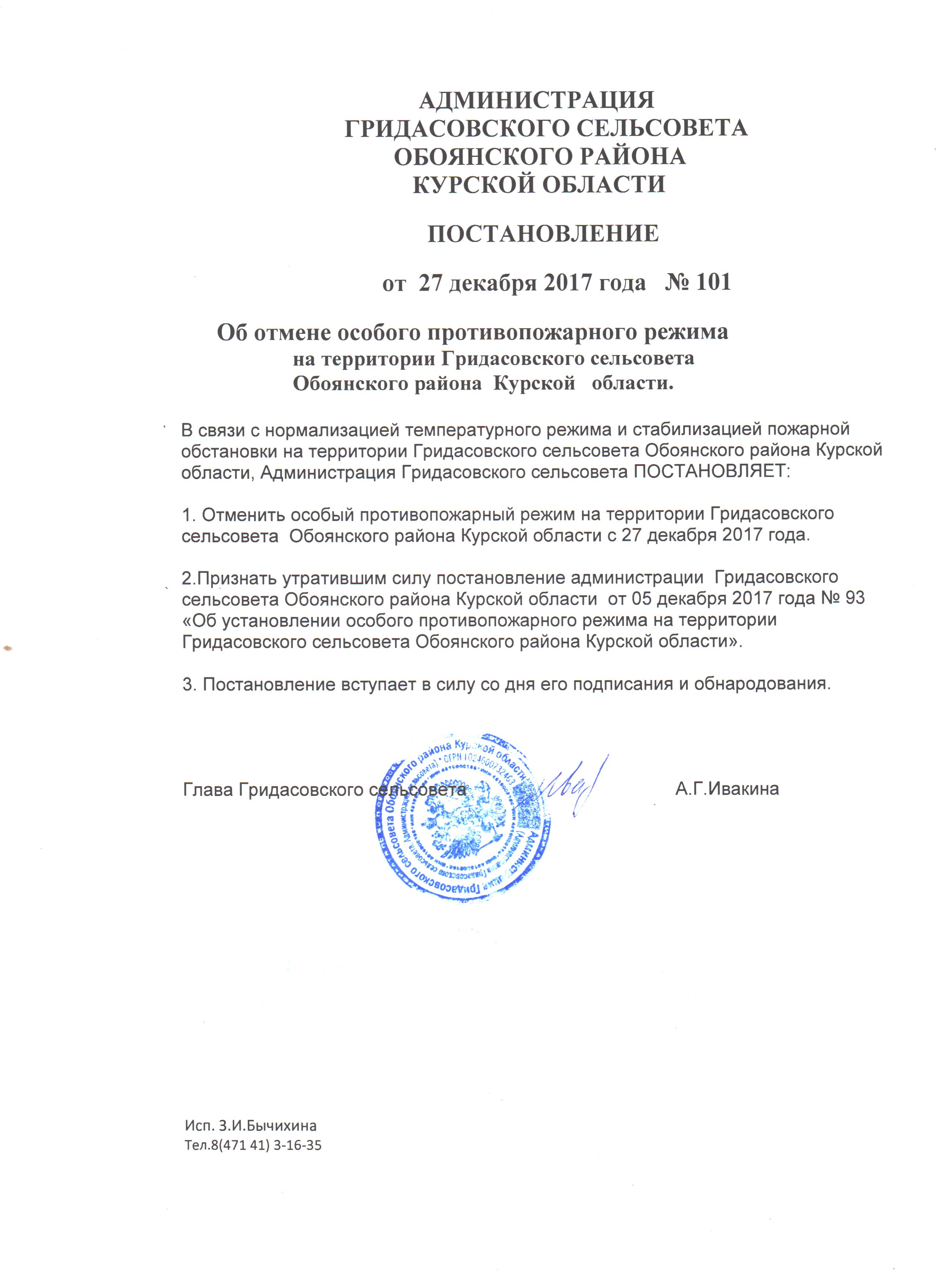 Постановление Администрации Гридасовского сельсовета от 27.12.2017 г. № 101 "Об отмене особого противопожарного режима на территории Гридасовского сельсовета"